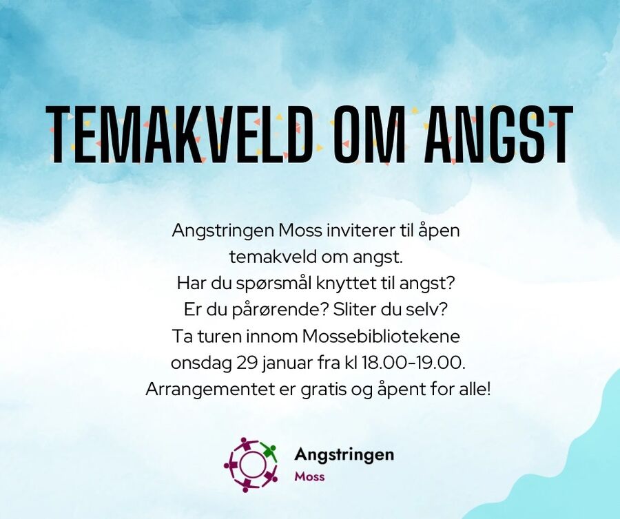 Om dette arrangementet Tid 18:00 Pris Gratis Bibliotek Moss bibliotek Målgruppe For voksen Debatt / Føredrag Temakveld om angst 29.01.25 Velkommen til åpen temakveld om angst! Har du spørsmål knyttet til angst? Er du pårørende? Sliter du selv? Ta turen innom Mossebibliotekene onsdag 29 januar fra kl 18.00-19.00. Arrangementet er gratis og åpent for alle