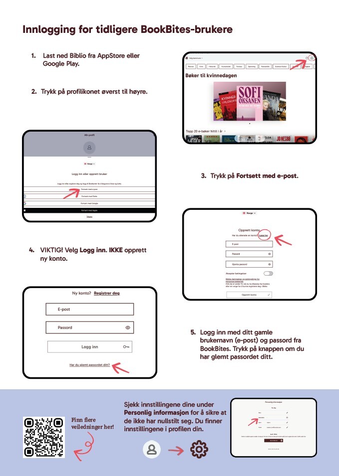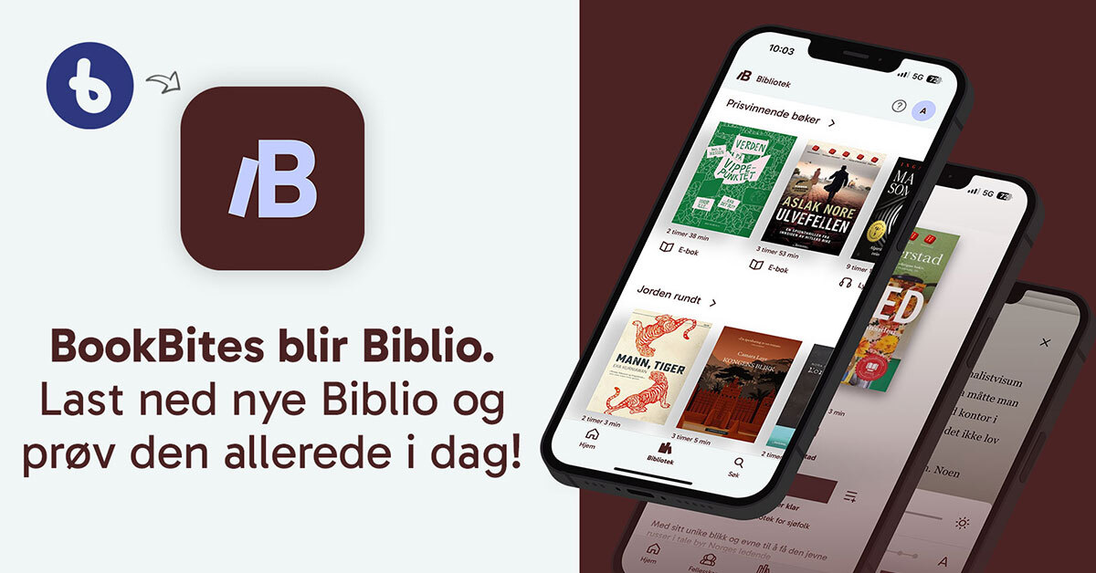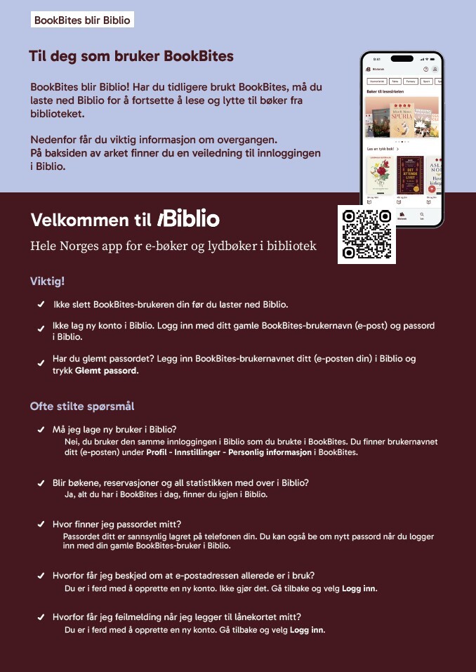 Har du tidligere brukt BookBites, må du laste ned Biblio for å fortsette å lese og lytte til bøker fra biblioteket. Hvis du er ny bruker så finner du en veiledning her.