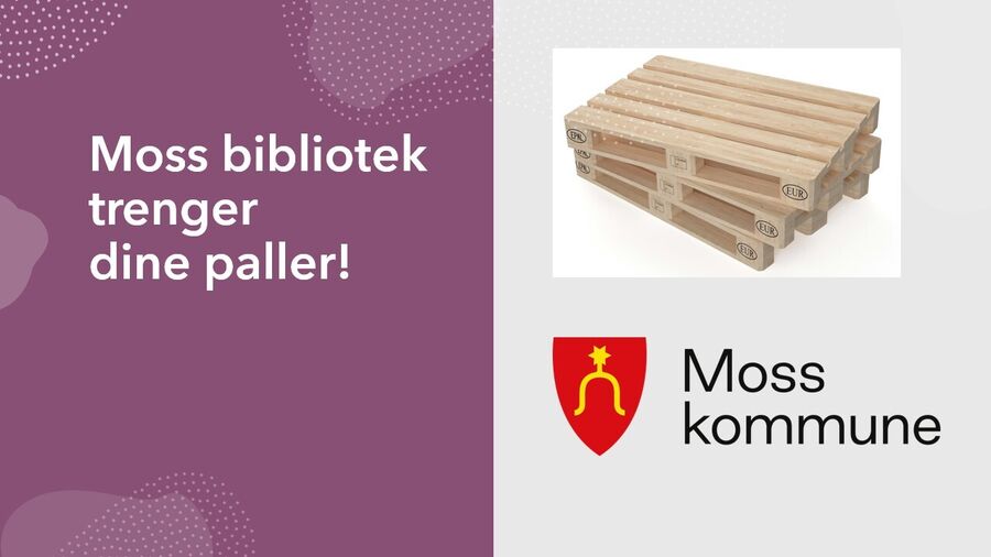 Moss bibliotek skal pusses opp, og vi må derfor flytte alle bøkene midlertidig til lagring et annet sted. Derfor trenger vi så mange paller som mulig. Pallene må leveres på Moss bibliotek da vi ikke har mulighet til å hente selv.