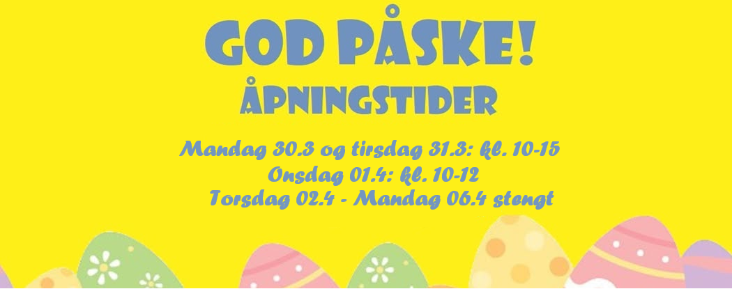 Mandag 30.3 og tirsdag 31.3 kl. 10-15, onsdag 01.4 kl. 10-12, torsdag 02.4 til og med mandag 06.4 stengt.