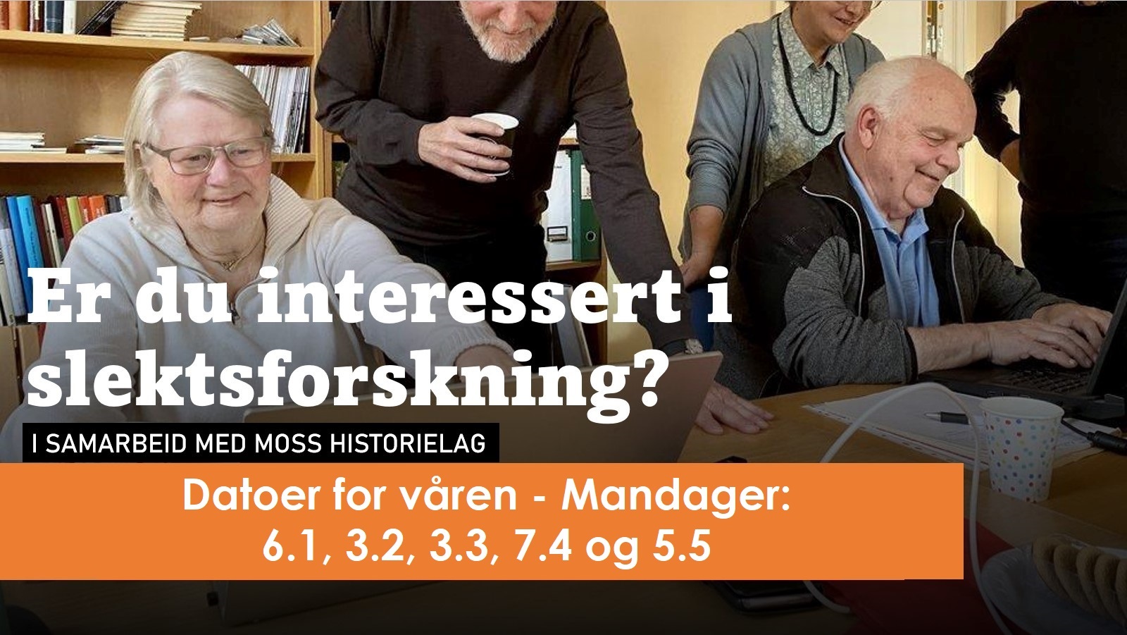 Slektsforskergruppa i Moss Historielag har møter her i biblioteket første mandag hver måned kl 17-19.