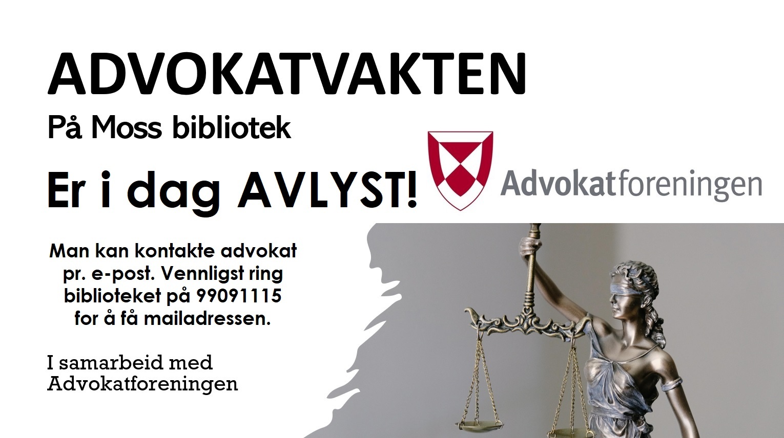 Om dette arrangementet Tid 16:30 Pris Gratis Bibliotek Moss bibliotek Målgruppe For voksen Kurs Advokatvakten på Moss bibliotek ER AVLYST 13.02.25 Advokatvakten er avlyst - man kan kontakte advokat pr. e-post. Ta kontakt med biblioteket på telefon 99 09 11 15 for å få advokatens epost.